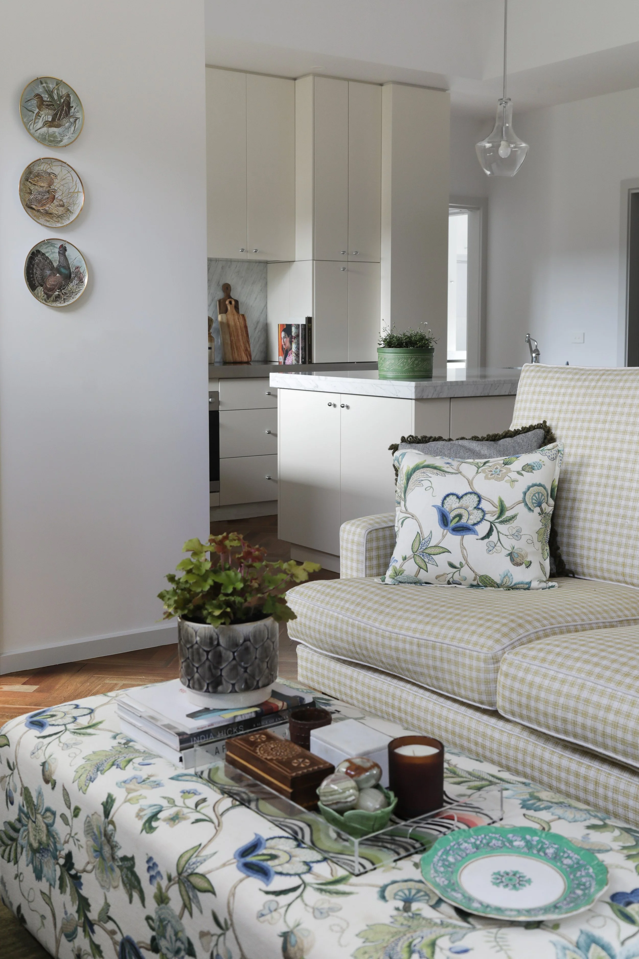 Working within a considered budget, priorities were carefully placed to create maximum impact while remaining true to the brief. The parquet floors were restored, walls repainted in soft, uplifting tones, and the marble benchtop rehoned to reveal its quiet beauty. Custom furnishings, tactile fabrics and a considered palette — pastel shades paired with confident hits of colour — brought energy and harmony to the rooms, balancing the client’s pieces with a renewed sense of belonging.